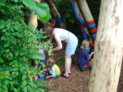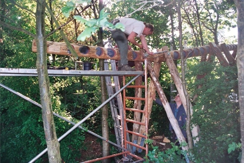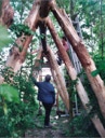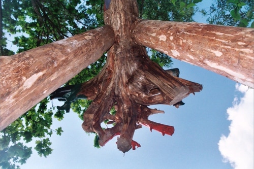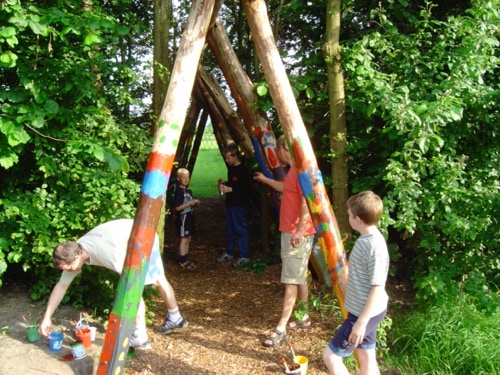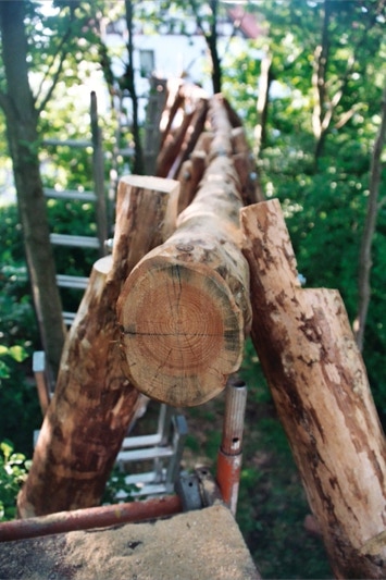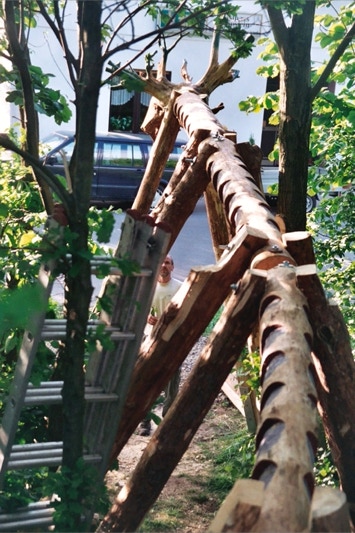 Durch einen breiten Grünstreifen, der einen Spielplatz von einer Straße trennt, sollte ein Zugang geschaffen werden. Aus ganzen Fichtenstämmen gestaltete ich einen mehrgliedrigen „Tausendfüßler“. Der breitbeinige Stand und die Höhe von über drei Metern ermöglicht nun das Betreten des Spielplatzes durch die Beine hindurch. Den Kopf bildet ein Stamm mit Wurzel.