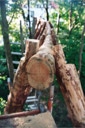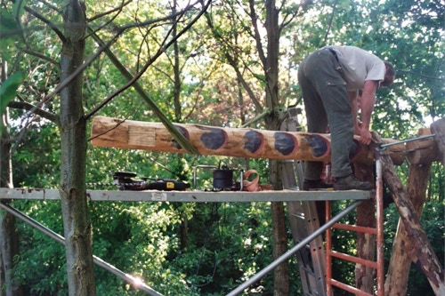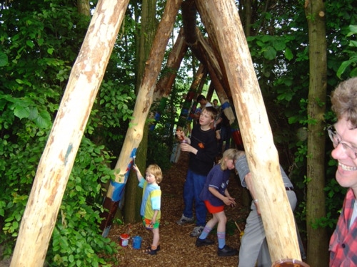 Durch einen breiten Grünstreifen, der einen Spielplatz von einer Straße trennt, sollte ein Zugang geschaffen werden. Aus ganzen Fichtenstämmen gestaltete ich einen mehrgliedrigen „Tausendfüßler“. Der breitbeinige Stand und die Höhe von über drei Metern ermöglicht nun das Betreten des Spielplatzes durch die Beine hindurch. Den Kopf bildet ein Stamm mit Wurzel.